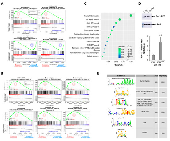 Figure 4. Gene set enrichments associated with resistance to 5-FU-based therapies. (A) Gene Set Enrichment Analysis (GSEA) associated with the transcriptome of recurrent phenotype following 5-FU-based chemotherapies using the Reactome database. (B) GSEA associated with the 5000 most explanatory genes in the recurrent phenotype after 5-FU-based chemotherapies selected by the Recursive Feature Elimination algorithm (RFE); gene sets from ‘c2.cgp.v2023.1.Hs.symbols.gmt’ database were employed to perform the analysis. The normalized enrichment scores (NES) and false discovery rate q-values (FDR q-val) are indicated within each graph. Positive and negative enrichments are specified by upward- and downward-pointing arrows, respectively. (C) over-representation analysis (ORA) of the 5000 most explanatory genes selected by RFE. Dot size is proportional to the number of genes associated with a term. Dot color indicates the p-value resulting from the ORA analysis. (D) Rac1 activation in control (CT26) and 5-FU resistant (CT265FUR) cells determined by pull-down assays. Levels of Rac1-GTP and total Rac1 were analyzed by Western blot (upper panel) and quantified by ImageJ (lower panel). (E) Transcription factor binding sites found enriched in the promoter regions of 5000 RFE retained genes. The NES and percentage of regulated genes (targets) are also indicated. The motif column shows sequence logos. The logos horizontal axis represents base positions (Adenine: green, Cytosine: blue, Thymine: red, Guanine: orange) in the DNA, with the 3' end indicating strand orientation. The vertical axis shows information in bits, and letter height reflects base frequency at each position. ** p ≤ 0.01.