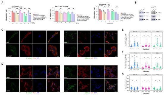 Figure 5. Characterization of 5-FU resistant cells and viability assays. (A) Viability of CT265FUR, HCT1165FUR, and HT295FUR cells treated with selected drugs individually and in combination with 5µM 5-FU (N = 3). (B) Representative immunoblots showing modulation of epithelial marker expression associated with generation of resistance (left panel) and reversion of the expression after Rac1 inhibition (right panel). For loading control, we used the abundance of endogenous beta-actin (E-Cad: E-Cadherin; B-Cat: β-catenin; B-Act: beta-actin). (C,D) Confocal images for immunofluorescent detection of E-Cadherin (green color, left panel) and β-catenin (green color, right panel) in CRC cells counterstained with F-actin and nuclei (red and blue colors, respectively, scale bar = 10 μm). (EG) Cells area, nuclei area, and nucleus/cell area relationship were quantified for each cell line (N > 50 per treatment). The red line indicates the median of the distribution. *, p ≤ 0.05; **, p ≤ 0.01; ***, p ≤ 0.001.