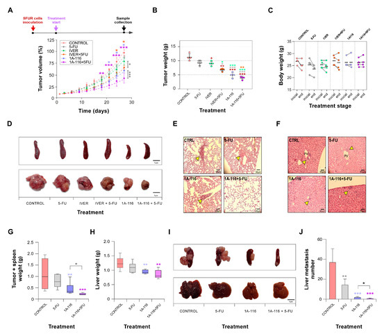 Figure 6. Ivermectin and 1A-116 in vivo studies. (A) BALB/c mice were subcutaneously challenged with CT265FUR cells. Ten days later, tumors became evident, and animals were randomly distributed in groups for treatment: control, 5-FU, ivermectin (IVER), ivermectin plus 5-FU (IVER + 5-FU), 1A116, and 1A116 + 5-FU (N = 4 per treatment). The tumor size was measured biweekly with a caliper and volume estimated (time  =  0 indicates the beginning of treatment). (B) At the end of the experiment, animals were euthanized, and tumors of each group were removed and weighed. (C) The body weight of the animals was measured at the beginning and at the end of the treatments to evaluate signs of its toxicity. (D) Representative images of tumor and spleen for each treatment group. (E) Hematoxylin and eosin lung staining images showing representative micrometastases (indicated with yellow arrows) for the control, 5-FU, 1A116, and 1A116 + 5-FU groups. (F) Hematoxylin and eosin liver staining images showing representative micrometastases (indicated with yellow arrows). (GJ) Analysis of Rac1 inhibition on experimental metastasis development. After intrasplenic injection, tumors containing spleens (G) and livers (H) were collected and weight (I). Representative images of spleens (upper panel) and livers (lower panel). (J) Metastasis were counted under a magnifying glass. *, p ≤ 0.05; **, p ≤ 0.01; ***, p ≤ 0.001.