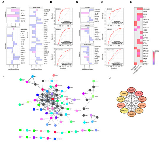 Important predictor genes from DEG list and the “reactome_signaling_by_rho_gtpases” gene set (https://www.gsea-msigdb.org/gsea/msigdb/cards/REACTOME_SIGNALING_BY_RHO_GTPASES, v7.3, accessed on 19 October 2024) were selected via least absolute shrinkage and selection operator (LASSO) logistic regression [40] in individual GEO series and in the merged matrix using the glmnet R package. To carry out the analysis, patients from each dataset were divided into training and validation sets in an 80–20 ratio, respectively. Optimal values for the penalty parameter λ were determined through 10-fold cross-validations. For model construction, we employed the lambda value giving minimal mean cross-validated error (lambda.min). The LASSO coefficient for recurrence predictor genes for each gene list was extracted. Receiver operating characteristic (ROC) curves were plotted to validate the prediction efficiency of the model using the ROCR (v 1.0.11) and pROC (v1.18.2) R packages [41,42]. We employed survival package (v3.5.7) [43] to perform a univariate Cox regression to assess the effect of the change in expression of individual predictor genes on the survival of patients in each dataset; genes with a LogRank < 0.01 were retained.