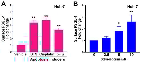 Apoptosis inducers induced surface PSGL-1 expression in Huh-7 cells. (A) Apoptosis inducers like staurosporine (STS; 10 μM), cisplatin (50 μM), and 5-FU (50 μM) increased surface PSGL-1 expression on Huh-7 cells after 4 h. (B) A dose-dependent increase in PSGL-1 expression on the surfaces of Huh-7 cells was observed with STS treatments ranging from 0 to 10 μM over 4 h. ** p < 0.01, * p < 0.05 vs. vehicle-treated groups (A,B). The vehicle groups (A,B) were set to 1-fold. Three experiments were performed with two replicates per group [N = 3 (3 independent experiments), with n = 2 (2 technical replicates per experiment)].