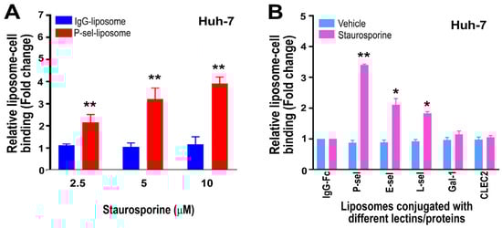 Huh-7 cell binding levels with fluorescent-dye-loaded liposomes were analyzed. Huh-7 cells were treated with or without the apoptosis inducer staurosporine, and their surface PSGL-1 expression (A) and engagement with fluorescein-loaded liposomes conjugated with various lectins and proteins (B) were measured using flow cytometry. Staurosporine treatment induced a dose-dependent increase in P-selectin (P-sel) liposome–Huh-7 cell interaction (A). ** p < 0.01 indicates a significant increase compared to the respective IgG-Fc–liposome groups (A). The IgG–liposome plus 2.5 μM STS-treated group (A) was set to 1-fold. (B) The conjugated lectins and proteins included IgG-Fc, P-selectin (P-sel), E-selectin (E-sel), L-selectin (L-sel), galectin-1 (Gal-1), and CLEC2. As these recombinant proteins contained an IgG-Fc portion, IgG-Fc was used as a control. (B) Both vehicle-treated and staurosporine-treated IgG-Fc groups were normalized to 1-fold. ** p < 0.01, * p < 0.05 indicates a significant increase compared to the respective IgG-Fc groups. The study comprised three experiments, with two replicates per group [N = 3 (3 independent experiments), n = 2 (2 technical replicates per experiment)].