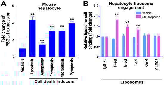 Surface PSGL-1 expression and engagement with liposomes conjugated to various lectins and proteins in primary ASGR1+ mouse hepatocytes. Primary ASGR1+ hepatocytes were treated with or without inducers of apoptosis (staurosporine, 10 μM), autophagy (rapamycin, 2 μM), ferroptosis (erastin, 20 μM), necroptosis (TNF-α, 0.2 μM), and pyroptosis (nigericin, 10 μM) for 4 h in vitro, followed by exposure to fluorescein-loaded liposomes conjugated with different lectins and proteins. Surface PSGL-1 expression levels (A) and cell–liposome engagement levels (B) were analyzed by flow cytometry. The conjugated lectins and proteins included IgG-Fc, P-sel, E-sel, L-sel, Gal-1, and CLEC2. Since these recombinant proteins all contained an IgG-Fc portion, an isotype-matched IgG-Fc was used as a control. Vehicle-treated groups (A) and IgG-Fc-treated hepatocyte groups (B) were normalized to 1-fold. ** p < 0.01 vs. vehicle-treated groups (A), ** p < 0.01 indicated a significant increase vs. respective IgG-Fc groups (B). The study was conducted with three independent experiments, each including two replicates per group [N = 3 (3 independent experiments), with n = 2 (2 technical replicates per experiment)].
