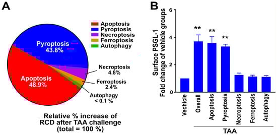 RCD profiling and PSGL-1 levels in hepatocytes from TAA-treated mice. (A) The RCD profile in ASGR1+ hepatocytes was assessed following TAA treatment using flow cytometry to evaluate changes in RCD levels. (B) Surface expression levels of PSGL-1 were measured in RCD-marker+ASGR1+ double-positive hepatocytes by flow cytometry. For example, in the apoptosis group, PSGL-1 levels were determined by identifying PSGL-1+ cells within the active caspase-3+ASGR1+ double-positive population. The “overall” groups were analyzed for PSGL-1 expression in ASGR1+ hepatocytes, independent of RCD markers. Vehicle control groups were normalized to a 1-fold change. ** p < 0.01 vs. respective vehicle-treated groups. The study was conducted with three independent experiments, each including two replicates per group [N = 3 (3 independent experiments), with n = 2 (2 technical replicates per experiment)]. A total of 12 mice were used in the study.