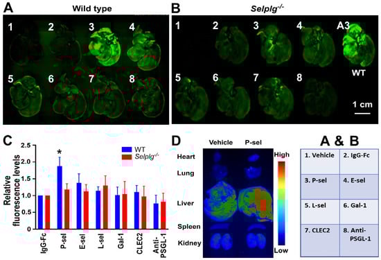 Dying-cell-specific targeting via the P-selectin–PSGL-1 axis demonstrated by fluorescent dye delivery to injured mouse liver. Following TAA-induced liver injury, wild-type (WT) (A) and PSGL-1 null (Selplg−/−) (B) mice were injected with fluorescein-loaded liposomes without protein conjugation (vehicle; 1), or conjugated to IgG-Fc (2), P-sel (3), E-sel (4), L-sel (5), Gal-1 (6), CLEC2 (7), and anti-PSGL-1 antibody (8). Fluorescent liver images are shown (A, B), and relative fluorescence intensities were quantified using ImageJ (C), in which the fluorescence levels of mouse liver in the IgG-Fc groups were normalized to 1-fold (C). (D) Pseudo-color imaging revealed that the system selectively delivered fluorescein to injured liver tissue while avoiding non-target organs like the lungs and spleen, where nanoparticles are typically retained. * p < 0.05 vs. IgG-Fc groups. Three experiments with two mice per group (n = 6). A total of 106 (53 WT, 53 Selplg−/−) mice were used in the study.