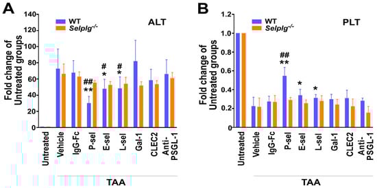 We aimed to test whether the apoptosis caspase-3 inhibitor z-DEVD, loaded as cargo in this P-selectin-based dying cell delivery system, could rescue mice from TAA-induced liver damage, and associated pathogenesis. In previous studies, we have shown that TAA challenges lead to increased circulating ALT levels and hepatitis-associated thrombocytopenia in mice []. Accordingly, we assessed these two parameters in the current system. Our findings indicated that P-selectin is the most effective molecule conjugated to the liposome, facilitating rescue from TAA-induced increases in circulating ALT and thrombocytopenia, compared to other proteins such as E-selectin, L-selectin, galectin-1, CLEC2, and anti-PSGL-1 Ig (Figure 7). Notably, this effect was observed only in wild-type mice, not in Selplg−/− mice (Figure 7), suggesting that the specific targeting of this delivery system is mediated through the P-selectin–PSGL-1 axis.
