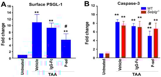 P-selectin-conjugated liposomes exert a rescue effect that is associated with the suppression of caspase-3 activities in mice. (A) Elevated surface PSGL-1 expression and (B) activated caspase-3 levels in TAA-treated mouse (wild type and Selplg−/−) hepatocytes in vivo were markedly rescued by treatments with P-selectin-conjugated liposomes (P-sel groups) loaded with caspase-3 inhibitor z-DEVD (5 × 107 liposomes, containing 2 μM z-DEVD/mouse). The measurements of untreated groups were normalized to 1-fold. ** p < 0.01, indicated markedly exacerbated vs. respective untreated control groups; # p < 0.05 indicated markedly ameliorated vs. respective IgG-Fc control groups. Three experiments with two mice per group (n = 6) were performed. A total of 48 (24 WT, 24 Selplg−/−) mice were used in the study.