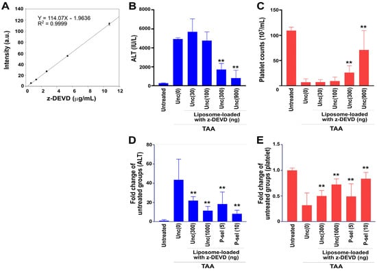 Markedly enhanced rescue efficiency was observed when Red-DEVD was loaded into P-selectin-conjugated liposomes in mice. (A) Quantification of Red-DEVD dosages was performed by measuring the fluorescence intensity of the fluorescent Red-DEVD. (B,C) In vivo testing of unconjugated liposomes (unc) loaded with Red-DEVD, with injection doses ranging from 30 ng to 900 ng per mouse [e.g., unc (30) represents unconjugated liposomes with 30 ng Red-DEVD], was performed to evaluate their ability to reduce TAA-induced increases in circulating ALT levels (B) and thrombocytopenia ((C), reduced platelet counts). The rescue effects on ALT levels (D) and thrombocytopenia (E) in TAA-treated mice, using unconjugated liposomes with Red-DEVD doses of 0–1000 ng per mouse, were compared to those using P-selectin-conjugated liposomes with Red-DEVD doses of 5–10 ng per mouse [e.g., P-sel (5) for P-selectin-conjugated liposomes with 5 ng Red-DEVD]. The untreated groups were normalized to 1-fold. ** p < 0.01 vs. respective TAA-treated unc (0) groups. Three experiments with two replicates per group (n = 6; (A–C)), and four experiments with three mice per group (n = 12; (D,E)) were conducted.