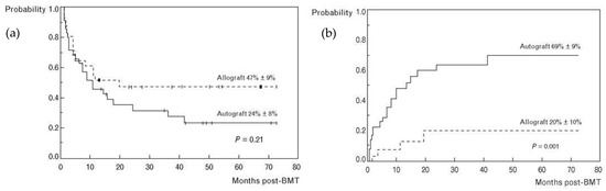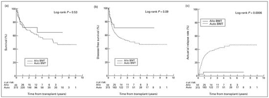 - Peniket, A.J.; de Elvira, M.C.R.; Taghipour, G.; Cordonnier, C.; Gluckman, E.; de Witte, T.; Santini, G.; Blaise, D.; Greinix, H.; Ferrant, A.; et al. An EBMT registry matched study of allogeneic stem cell transplants for lymphoma: Allogeneic transplantation is associated with a lower relapse rate but a higher procedure-related mortality rate than autologous transplantation. Bone Marrow Transplant. 2003, 31, 667–678. [Google Scholar] [CrossRef][Green Version]