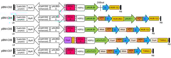 To compare the editing efficiency of different vector structures, four different dual sgRNA CRISPR pBM-C vectors were constructed (Figure 1). pBM-C underwent modifications using the pYL_Cas9Pubi_B construct [24]. Initially, the synthetic sequence pAtUBQ10+SV40NLS (Table S3) was inserted between the EcoRI and DraIII enzyme sites in the pYL_Cas9Pubi_B vector. Subsequently, the sequence AtCas9+SV40NLS+HSP (terminator, t) obtained from the PMOD_A501 vector (Addgene, Plasmid #91011) was integrated between the DraIII (New England Biolabs, NEB, USA) and MauBI (Thermo Scientific, Vilnius, Lithuania) cleavage sites via homologous recombination (Vazyme, Nanjing, China). Following this, the pAtU6-26+2XBsaI+gRNA-sc+AtU6-1 (t) module was obtained from the pKSE401 vector [34] and inserted at the AscI site to create the pBM-C02 vector. With pBM-C02 as the base skeleton, pBM-C04 and pBM-C05 use the Pol III U6 promoter from Arabidopsis to express the sgRNA cassette, while pBM-C06 and pBM-C07 use the Pol II promoter CmYLCV to express the sgRNA cassette. In the pBM-C06 vector, the Csy4 endonuclease sequence was synthesised after pAtUBQ10, and P2A was used to connect the Csy4 endonuclease sequence and AtCas9; Csy4 was used to space different sgRNAs (Figure 1). Subsequently, the terminator of AtU6 was used for pBM-C04 and pBM-C05 vectors, while the T35S terminator was used for pBM-C06 and pBM-C07 vectors to enhance the transcription termination of the sgRNA expression cassette (Figure 1). Ultimately, highly efficient sgRNA1 and sgRNA3 were ligated into the vectors with synthetic methods, resulting in the formation of four dual-targeted gene editing vectors (Figure 1). The detailed structure of the pBM-C vectors is shown in Figure 1. The synthesised sequences are shown in Table S3.