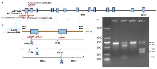 To screen the efficiently available sgRNAs from the predicted website, we selected three sgRNAs targeting the first and second exons of the CmPDS gene (Figure 2A); they all had a low predicted off-target rate. We obtained high levels of transcripts of these three sgRNAs through in vitro transcription and performed enzyme digestion experiments on PCR substrate DNA containing sgRNA target sequences using spCas9 protein and sgRNA transcripts to screen for efficient target sgRNAs. When the sgRNA is effective, it cleaves the substrate DNA at the corresponding positions, resulting in two DNA fragments of different sizes. Theoretically, sgRNA1 can cleave the substrate DNA into fragments of 113 and 531 bp; sgRNA2 can cleave the substrate DNA into fragments of 170 and 474 bp; and sgRNA3 can cleave the substrate DNA into fragments of 358 and 286 bp (Figure 2B). Agarose gel electrophoresis showed that sgRNA1 and sgRNA3 could efficiently cleave 644 bp substrate DNA. Specifically, sgRNA1 produced fragments of 113 bp and 531 bp, while sgRNA3 produced fragments of 358 bp and 286 bp (Figure 2C). In contrast, sgRNA2 did not effectively cleave the 644 bp substrate DNA (Figure 2C). These results indicated that they were high-efficiency sgRNAs. Therefore, we selected sgRNA1 and sgRNA3 as efficient targets for addition to the four designed CRISPR system vectors (see Figure 1).