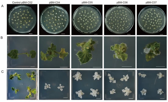 Phenotypes among four pBM-C CRISPR vectors. The pBM-C02 is the control vector. (A) The explants after immersion with different Agrobacterium edit vectors following physical treatment. Bar = 1 cm. (B) The chimeric phenotypes of melon seedlings are mainly characterised by leaf edge albinism. Bar = 1 cm. (C) The completely albino phenotypes with different vectors. Bar = 1 cm.