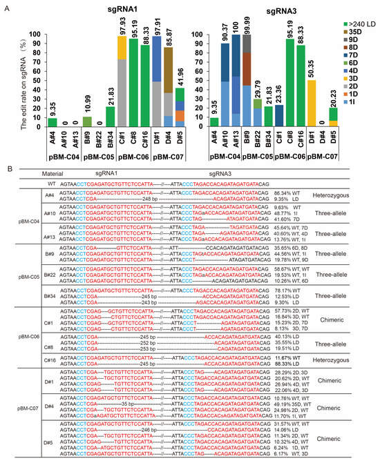 Due to the varying specificity of different target sites, different sgRNA sites exhibit different editing efficiencies. To analyse the editing types at the two target sites, we statistically evaluated the editing results of different vectors. Hi-TOM results showed that the number of edits at sgRNA3 using the pBM-C04 and pBM-C05 vectors was four times higher than that at sgRNA1, while the number of edits at sgRNA1 using the pBM-C07 vector was higher than those at sgRNA3 (Table 2). The number of mutations at the two target sites using the pBM-C06 vector was similar, mainly because the proportion of LD between the two target sites in pBM-C06 accounted for 15/19 (Table 2). Further analysis revealed that the proportion of LD generated by the pBM-C06 vector reached 78.95%, which is 2.3 to 6.3 times higher than that of other vectors producing LD-type mutations (Table 2). Hi-TOM analysis showed that four CRISPR pBM-C vectors generated mutants containing 1 bp insertions, indels, and LDs (Figure 4A,B). Specifically, the mutations induced by the pBM-C04, pBM-C05, and pBM-C07 vectors predominantly involved 1 bp insertions and <10 bp indels (Figure 4A,B). Complete editing of a single sgRNA site was present in edited seedlings produced by all four vectors. (the total of the mutation types > 95%, Figure 4A). Analysis of the two sites simultaneously showed that all edited seedlings contained chimeras, heterozygotes, and three alleles (Figure 4B). These results suggest that the Pol II vector pBM-C06 had a greater advantage in generating large deletions between the two neighbouring sites compared to other vectors.
