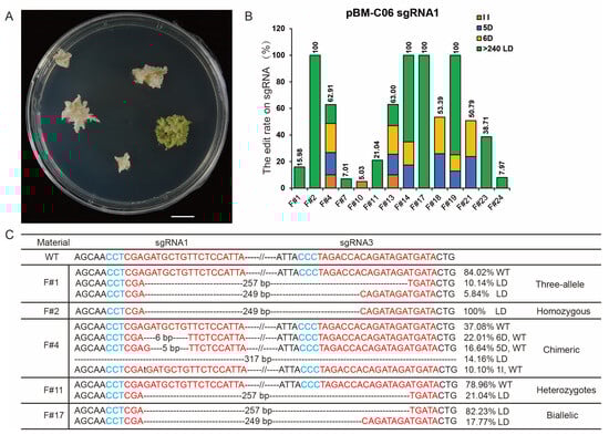 Since the pBM-C06 vector exhibited the highest genetic transformation efficiency in melon, and sgRNA1 and sgRNA3 effectively targeted the watermelon ClPDS gene (Figure S1), we performed genetic transformation using the pBM-C06 vector in the watermelon D66 cultivar. Due to the high contamination rate observed after treating watermelon explants with physical methods involving nano-brushes, ultrasound, and vacuum pumps, the watermelon explants were immersed in the pBM-C06 Agrobacterium suspension for 15 min. We obtained 34 Bar-positive seedlings from 221 cotyledon explants, which showed a transformation efficiency of 15.44%. In watermelon, the pBM-C06 vector was highly efficient in producing regeneration seedlings with albino and chimeric phenotypes (Figure 5A), and Hi-TOM results showed that the gene editing efficiency was 41.48% (14/34). Genotypic analysis of 14 edited seedlings revealed four types of resulting mutations: 1-base insertion, 5- or 6-base deletion, and >240 bp LD between the two target sites, while the sgRNA1 site had no other type of editing except for large deletions (Figure 5B,C). The LD-type mutation between the two target sites accounted for 71.43% (10/14) of all mutations. The pBM-C06 vector produced 14 edited seedlings containing homozygous, heterozygotes, chimeras, biallelic, and three alleles (Figure 5B,C), four of which had 100% mutation frequency at the sgRNA1 site (Figure 5B). These results suggest that the Pol II vector pBM-C06 is also suitable for watermelon genome editing and is also more likely to produce large deletions between the two neighbouring sites.