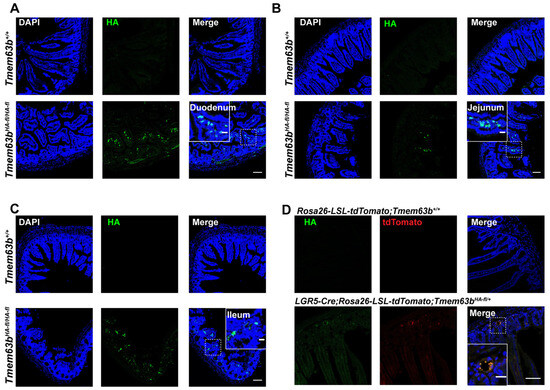To investigate the expression pattern of TMEM63B in the mouse intestines, we generated a knock-in (KI) reporter mouse expressing HA-FLAG-tagged TMEM63B, with the tags strategically inserted after the N-terminal signal sequence in exon 2 [25]. Additionally, two LoxP segments were inserted at the first and fourth introns to facilitate the generation of cKO mice. Subsequently, we examined TMEM63B localization in the mouse intestines using an HA antibody for immunostaining. The results showed the luminal and basal expression of TMEM63B at the base of the crypts of duodenum, jejunum, and ileum epithelia (Figure 1A–C). To assess whether TMEM63B is specially expressed in ISCs, we crossed LGR5-Cre; Tmem63bHA-fl/HA-fl mice with Rosa26-tdTomato mice to generate LGR5-Cre; Rosa26-tdTomato; Tmem63bHA-fl/+ mice. Interestingly, colocalization between HA-TMEM63B and tdTomato was observed at the crypt region (boxed area) of the small intestine (Figure 1D). Taken together, these findings suggest that TMEM63B is enriched in the small intestine, particularly within ISCs.