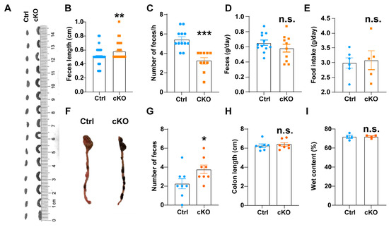 After food intake, the digestion of food leads to an increase in intestinal contents, subsequently inducing the expansion of intestinal volume. This expansion activates mechanosensitive ion channels expressed in the intestines, such as TRPs [32,33] and PIEZO channels [19,21,34,35]. Previous study has demonstrated that TrpA1 channel is involved in regulating ISCs proliferation in Drosophila [36]. Additionally, it has been reported that PIEZO channel expressed on chromaffin cells of Drosophila can regulate intestinal transport [19]. In this study, we identified that TMEME63B, a mechanosensitive ion channel [22,23,25,28], is highly expressed in the gut and may play a role in regulating GI motility (Figure 1). To analyze the function of the TMEM63B channel in ISCs, we specifically deleted TMEM63B in ISCs by crossing KI mice with LGR5-Cre mice (Ctrl, Tmem63bHA-fl/HA-fl; cKO, LGR5-Cre; Tmem63bHA-fl/HA-fl). Moreover, we assessed the GI motility by examining the fecal morphology to investigate the function of TMEM63B within the GI tract.