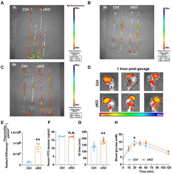 We then assessed the gastrointestinal transit time by examining the distribution of a fluorescent dye administered orally along the gastrointestinal tract. The intensity of fluorescence was used to quantify the amount of dye present. The TMEM63B cKO and control mice were sacrificed at 1 h, 3 h, and 6 h after gavage with FITC-dextran. Whole gastrointestinal tracts were then collected, and fluorescent dye distributions were visualized using IVIS-spectrum imaging. There was a significant retention of fluorescent dye in the stomachs or intestines of TMEM63B cKO mice compared to control mice at different times (Figure 3A–C). Notably, substantial amounts of dye remained in the stomach of TMEM63B cKO mice at 1 h, whereas in control mice, it had already reached the cecum by this time (Figure 3A,D,E). Serum samples collected at 4 h after administering the dye showed no significant difference in the dye concentration between cKO and control mice, indicating that the deletion of TMEM63B in ISCs did not affect intestinal permeability (Figure 3F). Additionally, we evaluated the gastrointestinal digestion and metabolism time by treating the mice with a paste containing carmine red and methylcellulose in specific proportions and measuring the excretion time for the first appearance of red stool. The excretion time for red feces was significantly prolonged in cKO mice (Figure 3G), further supporting impaired digestive function and metabolism due to TMEM63B deletion. To evaluate the nutrient absorption and digestion efficiency, both control and cKO mice were orally administered with sucrose, a disaccharide that requires intestinal digestion to be converted into monosaccharides. Next, the blood glucose levels were measured. Our results showed that blood glucose levels peaked at 30 min followed by a rapid decline in control mice (Figure 3H). In contrast, the TMEM63B cKO mice exhibited a slower rise to peak blood glucose levels which sustained up to 60 min before declining (Figure 3H). Overall, these results suggest that the deletion of TMEM63B in ISCs leads to the functional alterations in the intestines through affecting nutrient digestion and metabolism.