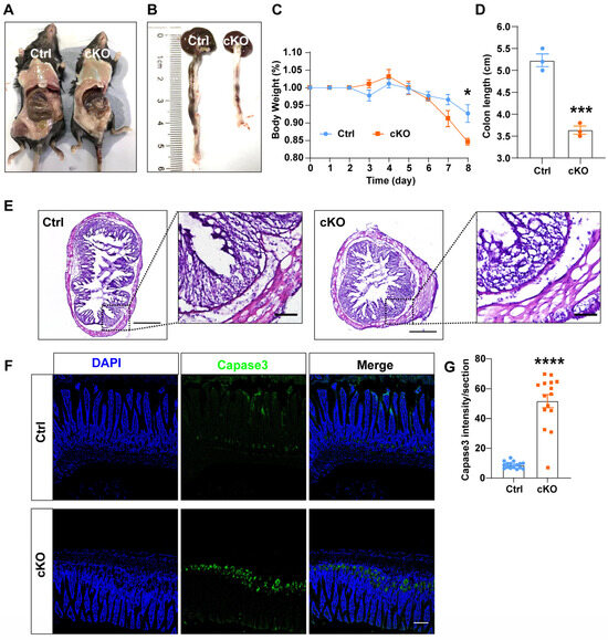 TMEM63B deficiency exacerbates the development of colitis in mice induced by DSS treatment. (A) Representative images depict control and cKO mice treated with DSS on day 8. (B) Representative colon images from the control and cKO mice are as shown in (A). (C) Body weight changes expressed as a percentage of initial weight for control and cKO mice following DSS treatment (n = 3 mice per group, unpaired two-tailed t test: * p < 0.05). (D) Quantification of the effect of DSS treatment on colon length in control and cKO mice (n = 3 mice per group, unpaired two-tailed t test: *** p < 0.001). (E) Representative images for H&E staining of colon sections from the control and cKO mice at indicated time points after DSS treatment. The scale bars represent 200 μm for low-magnification images and 100 μm for high-magnification images. (F) Representative images for immunofluorescence staining using jejunum samples of control and cKO mice (Blue: nuclei; Green: Capase3, scale bar = 100 µm). (G) Quantification of the intensity of caspase3 in jejunum crypts of control and cKO mice after DSS treatment (n = 3 mice per group, unpaired two-tailed t test: **** p < 0.0001).