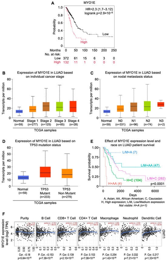 - Jusue-Torres, I.; Tiv, R.; Ricarte-Filho, J.C.; Mallisetty, A.; Contreras-Vargas, L.; Godoy-Calderon, M.J.; Khaddour, K.; Kennedy, K.; Valyi-Nagy, K.; David, O.; et al. Myo1e overexpression in lung adenocarcinoma is associated with increased risk of mortality. Sci. Rep. 2023, 13, 4107. [Google Scholar] [CrossRef] [PubMed]
