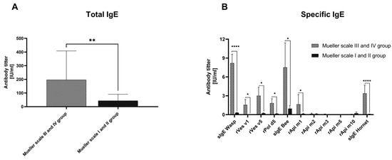 Total (A) and specific IgE (B) concentrations were determined in the serum of patients from the Mueller scale III and IV group and Mueller scale I and II group (Mueller scale I and II). Results are presented as mean ± SEM. * p < 0.05; ** p < 0.01; **** p < 0.0001.