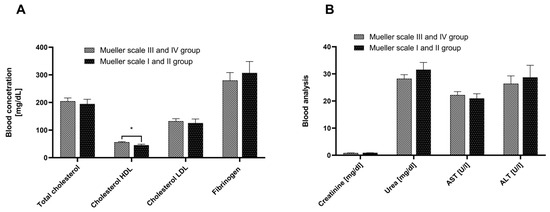Participants in both the Mueller scale III and IV and Mueller scale I and II groups did not exhibit any significant deviations from the norm in terms of total cholesterol and LDL concentrations. However, the HDL level was slightly lower in the Mueller scale I and II group compared to the Mueller scale III and IV group (approximately 20% lower, p < 0.05). Both groups showed normal kidney function, with creatinine and urea levels within the standard range, and normal liver function, with AST and ALT levels also within the norm. Fibrinogen levels were comparable between the two groups. The data described above are presented in Figure 2.
