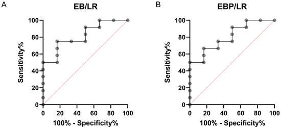 Receiver Operating Characteristic (ROC) curves for EB/LR (A) and (B) EBP/LR indexes. Panel A shows the ROC curve for EB/LR with an AUC of 0.8194 (95% CI: 0.6188–1.000, p = 0.0312). Panel B presents the ROC curve for EBP/LR, with an AUC of 0.8056 (95% CI: 0.5984–1.000, p = 0.0394).