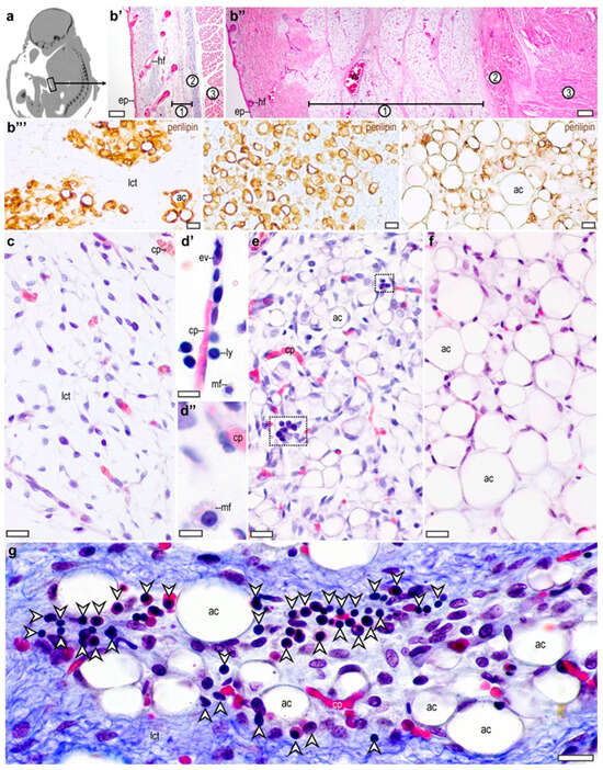 Development of the subcutaneous adipose tissue depot of the abdominal wall in the human fetus. (a) Computed tomography image showing sagittal section of a human fetus in the late third trimester. Abdominal wall at the level of the umbilical cord is indicated in frame. Original image, retrieved from a postmortem computed tomography scan performed in our previous study [25]. (b’) Cross section of the abdominal wall of the human fetus at the 17th week of gestation. ep: epidermis, hf: hair follicle, 1: subcutaneous connective tissue layer with preadipocytes, 2: collagen fibers, 3: muscular wall of the abdomen. Masson’s trichromic staining. Scale bar: 200 μm. (b’’) Cross section of the abdominal wall in the third trimester. ep: epidermis, hf: hair follicle, vs: vesicles, 1: subcutaneous fat layer, 2: collagen fibers, 3: muscular wall of the abdomen. Hematoxylin and eosin staining. Scale bar: 200 μm. (b’’’) Perilipin immunostaining of the developing adipose tissue. From left to right: week 17, week 21 and week 38. ac: adipocyte, lct: loose connective tissue. Scale bar 50 μm. (c) Subcutaneous connective tissue layer of the abdominal wall from the second trimester (17th week) of gestation. cp: capillary, lct: loose connective tissue. Masson’s trichromic staining. Scale bar: 30 μm. (d’) Capillary from the subcutaneous connective tissue at the 20th gestational week. ev: extravasating leukocyte, cp: capillary, ly: lymphocyte, mf: macrophage, scale bar 30 μm. (d’’) Macrophage (mf) in the subcutaneous connective tissue at the 20th gestational week. cp: capillary. Scale bar 5 μm. (e) Subcutaneous adipose tissue at the 21st week of gestation. ac: adipocyte, cp: capillary. Dotted lines mark regions with immune cell infiltration. Masson’s trichromic staining. Scale bar 30 μm. (f) Subcutaneous adipose tissue at the 30th week of gestation. ac: adipocyte, Masson’s trichromic staining. Scale bar 30 μm. (g) Infiltrating immune cells in the subcutaneous adipose tissue at gestational week 23. lct: loose connective tissue, ac: adipocyte, arrowheads label immune cells. Scale bar 50 μm.