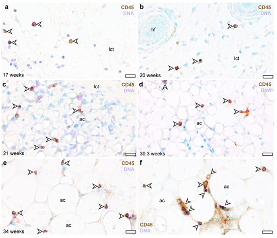 CD45 immunostaining of the abdominal subcutaneous adipose tissue in the human fetus. (a) Subcutaneous connective tissue at gestation week 17. (b) Subcutaneous connective tissue at gestation week 20. (c) Developing subcutaneous adipose tissue depot at gestation week 21. (d) Subcutaneous adipose tissue at gestational week 30. (e) Subcutaneous adipose tissue at gestational week 34. (f) Subcutaneous adipose tissue of a newborn (born at completed gestational week 36). Arrowheads label CD45+ cells. lct: loose connective tissue, ac: adipocyte, hf: hair follicle. DNA stained with methyl green. Scale bar 30 μm.
