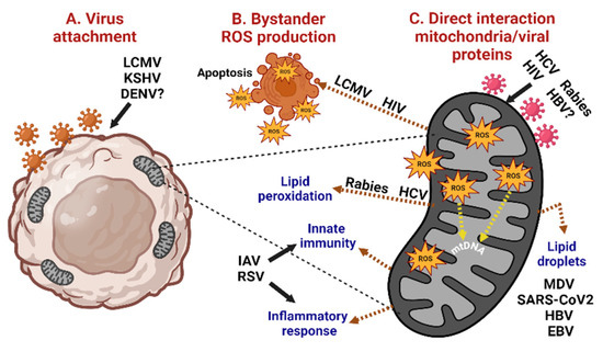 Mitochondrial ROS production and the effects on virus infection. (A) Virus attachment triggers ROS generation. (B) ROS favors further virus binding to neighboring cells (bystander effect), which may lead to apoptotic cell death. (C) Direct interaction of viral proteins with mitochondrial components induces ROS production, leading to apoptotic cell death, alterations in lipids metabolism, activation of innate immunity, and the inflammatory response. DENV: dengue virus; LCMV: lymphocytic choriomeningitis virus; HIV: human immunodeficiency virus; KSHV: Kaposi’s sarcoma-associated herpesvirus; HCV: hepatitis C virus; HBV: hepatitis B virus; MDV: Marek´s disease virus; EBV: Epstein–Barr virus; RSV: respiratory syncytial virus; IAV: influenza A virus; mtDNA: mitochondrial DNA.