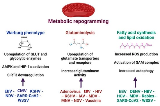 Virus replication is energetically and metabolically very demanding [77]. Viruses cope with these demands, inducing metabolic reprogramming, including the upregulation of enzymes that control the metabolic pathways [78,79]. The metabolic switch enhances glycolysis (Warburg effect), glutaminolysis, and lipid oxidation [78] (Figure 4). An upregulated pentose phosphate pathway and changes in amino acid metabolism after viral infections have also been reported [80]. Some viruses may turn on more than one pathway to support their energetic needs, while different cellular metabolic pathways may be activated at distinct stages of the virus life cycle [81,82].