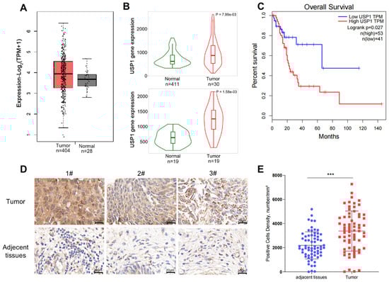 USP1 is overexpressed in bladder cancer. (A) USP1 expression in bladder urothelial carcinoma tissues compared with normal tissues in the GEPIA web server. (B) USP1 expression in bladder urothelial carcinoma tissues compared with normal tissues in the TNMplot web server (the upper from unpaired tumor and normal tissues, and the lower from paired tumor and normal tissues). (C) Analysis of overall survival for 94 patients with bladder cancer based on USP1 expression in the GEPIA web server. The high USP1 group showed significantly lower survival rates (p = 0.027). (D) Immunohistochemical staining of USP1 in tissue microarrays containing bladder cancer and adjacent tissues. (E) Tissue microarray data of USP1 expression in 66 pairs of tumor and adjacent tissues was analyzed by digital pathology image analysis software, and the number of positive cells per square millimeter was calculated (*** p < 0.001). Data are presented as the mean ± SD. Statistical significance was analyzed by Student’s t test.