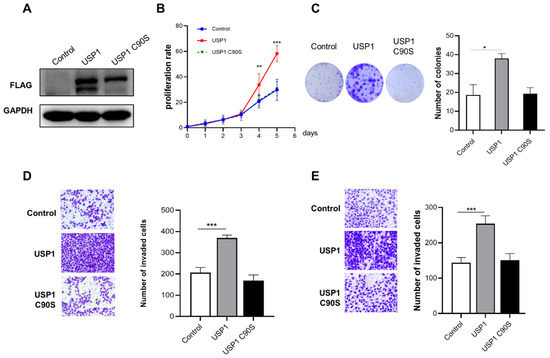 We found that USP1 expression in T24 bladder cancer cells was lower than that in UMUC3 bladder cancer cells. Therefore, T24 cells were selected for transfection with FLAG-USP1 or FLAG-USP1 C90S (a catalytically inactive mutant), and exogenous protein expression was analyzed using Western blotting (Figure 2A). We performed cell proliferation, colony formation, and Transwell assays to determine the effect of USP1 on bladder cancer cells. The results showed that exogenous overexpression of USP1 increased cell proliferation and colony numbers, but overexpression of USP1 C90S did not have the same effects (Figure 2B,C). Transwell assays indicated that the migration and invasion capability of overexpression of USP1, but not USP1 C90S, significantly increased (Figure 2D,E). The above results suggested that USP1 overexpression, but not USP1 C90S overexpression, promotes bladder cancer cell proliferation, migration, and invasion.