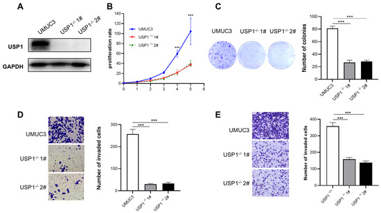 The CRISPR/Cas9 system was used to generate UMUC3 USP1-knockout cells. Western blotting was used to examine the expression of USP1 (Figure 3A). The results of the CCK-8 assay showed that USP1 deficiency significantly inhibited the proliferation of UMUC3 cells (Figure 3B), and the colony formation capacity of the USP1-deficient cells was lower than that of the wild-type cells (Figure 3C). Moreover, Transwell assays showed that USP1 deficiency repressed the migration and invasion of UMUC3 cells (Figure 3D,E). In summary, USP1 deficiency reduced the proliferation and migration of UMUC3 cells.