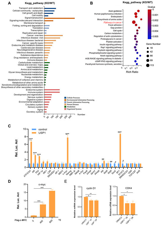 To explore the mechanism of action of USP1 in bladder cancer cells, we performed RNA-seq analysis using wild-type and USP1-knockout UMUC3 cells. The results of the KEGG pathway enrichment analysis indicated that multiple signaling pathways involving numerous biological processes were affected in USP1-deficient UMUC3 cells (Figure 4A). The ratio of total genes enriched by pathways in cancers was the largest (Figure 4B). Next, we used a luciferase reporter gene system to screen for potential pathways in HEK293T cells. The results showed that USP1 overexpression significantly increased the activity of some signaling pathways, especially c-MYC, ATF2/3/4, and SP1 (Figure 4C). Moreover, USP1 expression increased the c-MYC luciferase reporter activity in a dose-dependent manner (Figure 4D). We examined the expression of downstream target genes of c-MYC, including cycling D and CDK4, in USP1-deficient UMUC3 cells. Compared with parental cells, USP1-deficient UMUC3 cells had decreased mRNA levels of these genes (Figure 4E). The above results showed that USP1 influences bladder cancer cell behavior by regulating c-MYC pathway activity.
