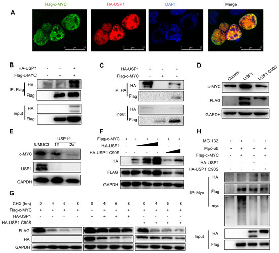 USP1 interacts with c-MYC and promotes c-MYC protein stability. (A) Immunofluorescence images of HA-USP1 (red) and FLAG-c-MYC (green) in HEK293T cells. DAPI was used as a nuclear stain (blue). (B,C) Immunoprecipitation experiments showed the interaction between USP1 and c-MYC in HEK293 cells. (D) Western blot analysis of c-MYC expression in USP1-overexpression T24 cells. (E) Western blot analysis of c-MYC expression in USP1-deficient UMUC3 cells. (F) Cells were transfected with increasing amounts of the HA-USP1 (0, 200, 400, and 800 ng), HA-USP1 C90S (400 and 800 ng), and FLAG-c-MYC plasmids, and Western blotting was performed to determine the effect of USP1 protein levels on c-MYC expression in HEK293T cells. (G) Cells were transfected with FLAG-c-MYC with HA-USP1 or HA-USP1 C90S, as indicated. Western blot analysis of c-MYC stability after treatment with CHX (50 μg/mL) for the indicated time. GAPDH served as a control. (H) Cells were co-transfected with FLAG-c-MYC and Myc-Ub with or without HA-USP1 or HA-USP1 C90S, treated with MG132 (10 μM) for 6 h, and then subjected to ubiquitination assays.