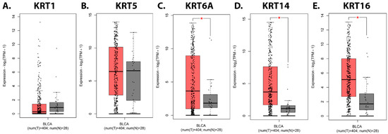 The transcript expression boxplots for KRT1, KRT5, KRT6A, KRT14, and KRT16 in normal vs. human bladder urothelial carcinoma (BLCA) was obtained using Gene Expression Profiling Interactive Analysis 2 (GEPIA2, http://gepia2.cancer-pku.cn/#index accessed on 25 September 2024) [34]. The p-value cutoff was 0.01 (p < 0.01). The correlation analysis was performed using a BLCA tumor with the Pearson correlation coefficient. A correlation between gene expression was considered significant when p < 0.05.