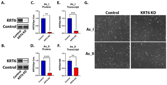 To efficiently knockdown the expression of KRT6 within our UROtsa As3+-transformed cells, we obtained two separate shRNA sequences that target human KRT6 and tested their ability to reduce KRT6 expression using Western blot in UROtsa As_I cells. Figure S2A,B shows that sequence “A” was the most effective (~90% reduction) in reducing KRT6 expression compared to sequence “B” or the combination of sequence “A” with sequence “B” (~60% reduction). Sequence “A” was used for the remainder of experiments in this manuscript. Figure 2A–F shows that KRT6 expression was reduced at the protein and transcript level in two separate As3+-transformed UROtsa cell lines (As_I and As_II). Figure S1 displays all the uncropped Western blot images used throughout the manuscript. The morphology of the cells was unchanged from knockdown of KRT6 (Figure 2G).