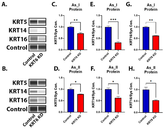 Since KRT6 is associated with the basal subtype of MIUC, we wanted to assess the expression of the other basal keratins (KRT1, KRT5, KRT14, and KRT16) after the knockdown of KRT6 in As_I and As_II cells. Figure 3A–H demonstrates that KRT5, KRT14, and KRT16 protein expression were also reduced in the UROtsa As_I and As_II cells after KRT6 knockdown. Figure S3A,B shows that the transcript of KRT1 was reduced in both the cell lines after KRT6 knockdown. We also wanted to evaluate the correlation of expression between KRT6A and the other basal keratins in human bladder cancer using GEPIA2. The analysis demonstrated that human KRT6A expression is correlated (p < 0.05) to the expression of these other basal keratins in human bladder cancer cases (Figure S4A–D).