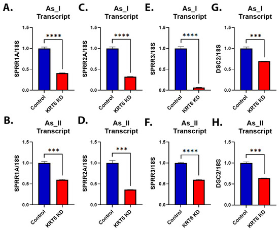 Expression of genes associated with SD after KRT6 knockdown in As3+-transformed UROtsa cells. (A,B) Quantification of mRNA transcript levels of SPRR1A after KRT6 knockdown in UROtsa As_I and As_II cells, respectively. (C,D) Quantification of mRNA transcript levels of SPRR2A. (E,F) Quantification of mRNA transcript levels of SPRR3. (G,H) Quantification of mRNA transcript levels of DSC2. All data are plotted as fold-change compared to the scramble control for each cell line. Gene expression was normalized to the 18S housekeeping gene. The measurements were performed in triplicate for gene expression data. The reported values are mean ± SEM. A t-test was performed, and asterisks indicate significant differences from the control (*** p < 0.001, **** p < 0.0001).