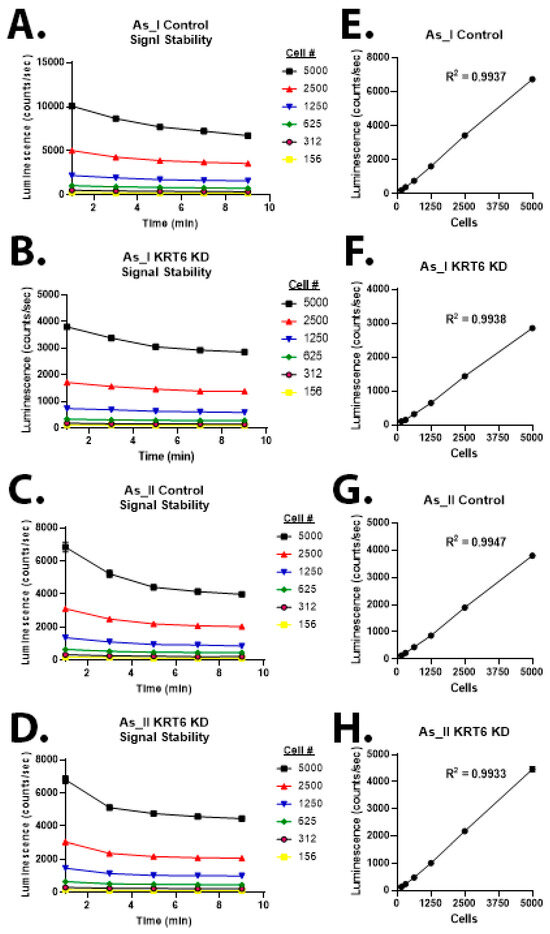 We designed our lentiviral vectors to express a puromycin gene (for selection), our targeted KRT6 shRNA or scrambled control, and a luciferase reporter. Since our control and KRT6 knockdown cells express luciferase, we wanted to utilize this characteristic to develop a growth/viability assay to monitor the proliferation rate and drug sensitivity for these cells for future experiments. We first assessed signal stability (Figure 5A–D) in each of the control and KRT6 knockdown cells. The results demonstrate that the luminescence signal was stabilized 10 min after adding the substrate (luciferin diluted to 150 µg/mL). This is the timepoint that was chosen for all luminescence readings in the remaining experiments. After luminescence is read, the luciferin-containing media can be removed and replaced with fresh media. The whole process (incubation, reading, the addition of fresh media) is less than 15 min. This allows us to measure cellular growth from day-to-day luminescence readings using the same cells on the same plate to limit the technical variability that can be associated with multi-plate growth assays. We next wanted to test the sensitivity and dynamic range of the assay (Figure 5E–H). We performed a two-fold serial dilution starting from 5000 and reducing to 156 cells in a 96-well plate. The results demonstrate a good correlation (R2 < 0.99) between the luminescence intensity and the number of cells seeded for each cell line.