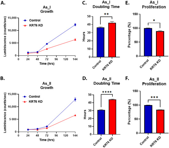 We utilized the luminescence assay to measure cell proliferation rates in the UROtsa As_I and As_II cells after KRT6 knockdown. Figure 6A,B show the luminescence intensity readings from 24 h, 48 h, 72 h, and 144 h and Figure 6C,D show the calculated doubling time of the As_I and As_II cells after KRT6 knockdown. The data show the KRT6 knockdown cells grow slower compared to their respective scramble control cells. To validate the luminescence growth assay results, we utilized a separate flow cytometry-based assay (Tag-It Violet™ Proliferation Assay) to measure cellular proliferation (Figure 6E,F). The results from this experiment confirm that the knockdown of KRT6 in UROtsa As_I and As_II cells slows their proliferation.
