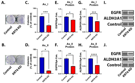 In vitro colony formation measures the ability of a single cell to divide into a colony of 50 or more cells and is reflective of the stemness and reproductive viability of cells [42,43]. The results from the colony formation assay between scramble control and KRT6 knockdown cells show that the KRT6 knockdown cells form fewer colonies (Figure 7A–D) than the scramble control cells. Epidermal growth factor receptor (EGFR) and aldehyde dehydrogenase 3 family member A1 (ALDH3A1) play important roles in cancer stem cell metabolism [29,30]. Therefore, we measured the levels of these two proteins in the As_I and As_II cells after KRT6 knockdown. The results from Figure 7E–J show that both EGFR and the ALDH3A1 protein are lower in the KRT6 knockdown cells. Additionally, Figure S3I–L demonstrates that the mRNA transcript levels of these two genes are reduced in the KRT6 knockdown cells. Additionally, Figure S4I,J shows that in human bladder cancer cases, the expression of these two genes is also correlated to the expression of KRT6A.