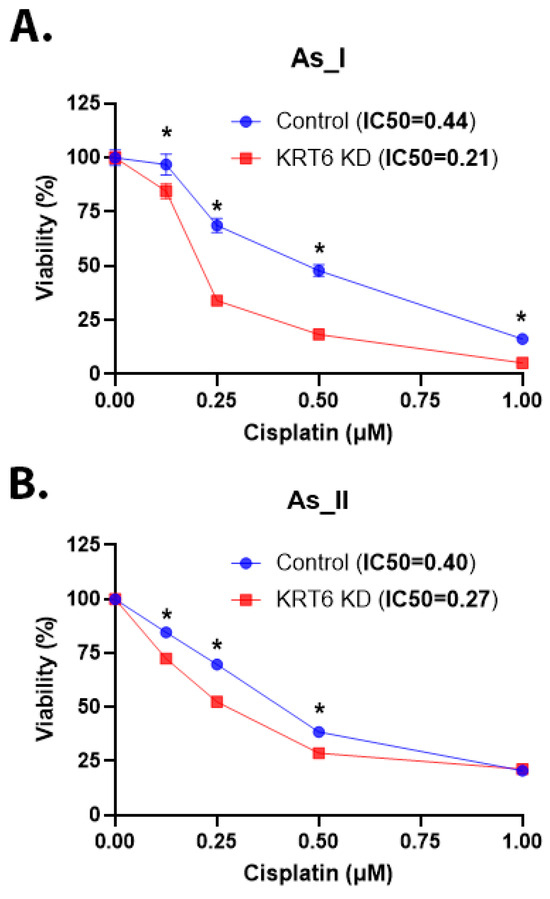 Cisplatin sensitivity of As3+-transformed UROtsa cells after KRT6 knockdown. (A,B) Viability (expressed in percentage) after 0.00 (control), 0.13, 0.25, 0.50, and 1 µM cisplatin treatment for 72 h in the UROtsa As_I and As_II cells, respectively. The IC50 values are reported in the top panel (next to sample names). Blue bars indicate control viability while red bars indicate viability in the KRT6 KD cells. 1250 cells were seeded/well in a 96-well plate and there were eight replicates for each dose. Twenty-four hours after seeding, the cells were dosed with either 0.00, 0.13, 0.25, 0.50, or 1 µM cisplatin treatment for 72 h. The reported values are mean ± SEM. A t-test was performed, and asterisks indicate significant differences from the control (* p < 0.05).