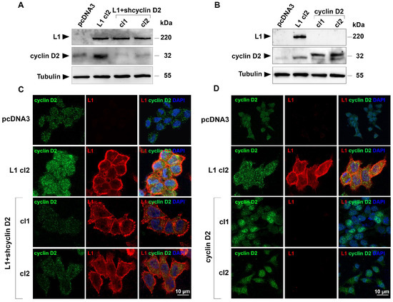 The colorectal carcinoma (CRC) cell lines HCT 116 (ATCC CCL-247) and LS 174T (ATCC CL-188) were grown in RPMI-1640 (Gibco, Thermo Fisher Scientific, Paisley, UK) supplemented with 10% Fetal Bovine Serum (FBS) (Gibco, Thermo Fisher Scientific, Paisley, UK) and 1% penicillin/streptomycin solution (Gibco, Thermo Fisher Scientific, Paisley, UK). LS 174T and HCT 116 cells stably expressing human L1 (full length) were maintained in RPMI-1640 medium containing 10% FBS and 1% penicillin/streptomycin solution, supplemented with 800 µg/mL G418 solution (Sigma-Aldrich, St. Louis, MO, USA). LS 174T cells stably expressing L1 co-transfected with shp65 and IκB-SR cDNA were cultured in a selective medium supplemented with G418 (800 µg/mL) and puromycin dihydrochloride (10 µg/mL) (Sigma-Aldrich, St. Louis, MO, USA), as described previously [29]. Individual LS 174T cell clones stably expressing L1 and shcyclin D2 were maintained in a selective RPMI-1640 medium containing both G418 (800 µg/mL) and puromycin dihydrochloride (5 µg/mL) (Sigma-Aldrich, St. Louis, MO, USA). LS 174T cells stably expressing cyclin D2 were maintained in a selective RPMI-1640 medium supplemented with G418 (800 µg/mL). Individually isolated clones (LS 174T-L1 cl2; LS 174T-L1+ shcyclin D2 cl1 and cl2, and LS 174T-cyclin D2 cl1 and cl2) were used in this study.