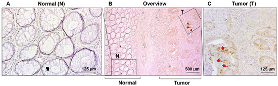 We wished to determine the localization and expression level of cyclin D2 in human CRC tissue. Immunohistochemical analysis with an antibody against cyclin D2 was conducted on 38 human formaldehyde-fixed CRC tissue samples. Intense nuclear staining was detected in cancer cells in 34% of the CRC tissue samples (Figure 6B,C, (T), red arrowheads). The adjacent normal mucosa was negative for cyclin D2 staining (Figure 6A,B (N)), with sometimes a very weak signal in individual cells. These results demonstrate that cyclin D2 is induced in CRC tissue and localized in cancer cell nuclei.