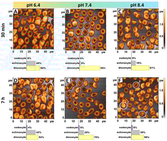 The AFM images of RBCs stored in a medium with pH levels of 6.4, 7.4, and 8.4 for 30 min (A–C) and for 7 h (D–F) are presented. The number of cells assigned to each cell type is indicated in the legend provided below each AFM map. The following shapes of RBCs are indicated in white circles in Figure (F): (1) codocyte, (2) echinocyte, and (3) discocyte.