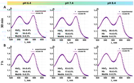 Following a seven-hour incubation period, no changes in the percentage of hemoglobin components were observed in all samples (Figure 5B). The exposure of erythrocyte suspensions to varying pH levels did not result in any alterations to the heights or positions of the peaks observed on the absorption spectra. Characteristic HbO2 peaks were observed in all samples at 542 nm and 577 nm.