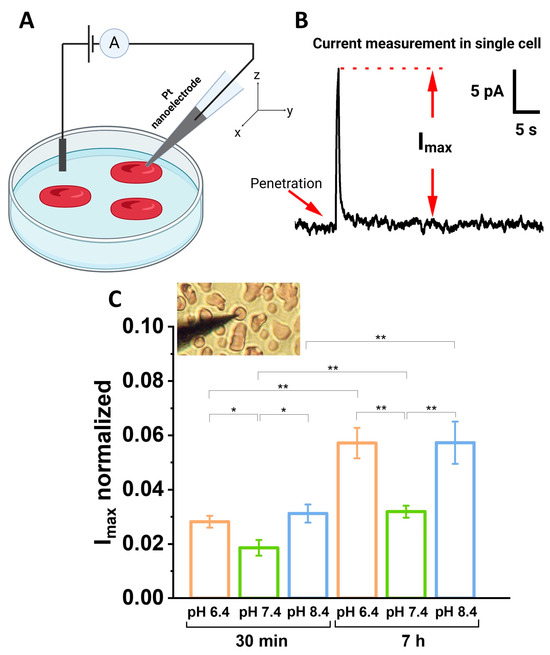 Subsequently, we analyzed the intracellular level of ROS in an individual erythrocyte, which serves as a biomarker of acidosis or alcolosis. This is because alterations in pH can indirectly affect metabolic processes and the activity of antioxidant systems, which can alter the level of ROS [27,28,29]. The amperometric detection of ROS using Pt nanoelectrodes (Figure 6A) was used as a low-invasive technique for single-cell analysis in real-time. This method involved recording the current inside a single cell at a potential of +800 mV, at which ROS decompose (Figure 6B) [24].