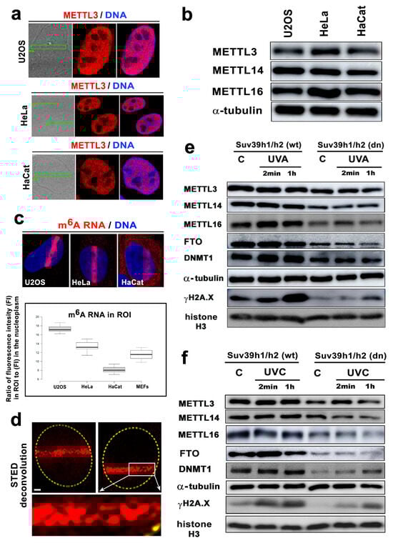 The level of m6A RNAs in microirradiated chromatin was the highest in the U2OS osteosarcoma cells. (a) METTL3 enzyme was not changed in the microirradiated U2OS and HeLa tumor cells or the HaCaT keratinocytes. (b) Western blotting also showed that the levels of METTL3, METTL14, and METTL16 in U2OS, HeLa, and HaCaT cells were almost identical. (c) In comparison to the other cell types, U2OS cells were characterized by the most pronounced accumulation of m6A RNAs at DNA lesions. In HaCaT cells, the level of m6A RNAs at the CPD sites was the lowest compared to that of the other cell types studied (see box plot). Scale bars in panels a-c represent 8 µm. (d) STED microscopy showed the focal distribution of the m6A RNAs in the microirradiated regions. Scale bars represent 2 µm. Western blot analysis of the levels of METTL3, METTL14, METTL16, FTO, DNMT1, and γH2AX in Suv39h1/h2 wt and Suv39h1/h2 dn nonirradiated cells and cells exposed to (e) a UVA lamp and (f) a UVC lamp. Protein levels were normalized to the levels of α-tubulin, and the level of histone proteins was normalized to total histone H3.