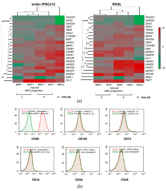 Differential gene expression and cell surface protein exposure during mesodermal specification of iPSCs. (a) Heatmaps showing the changes in gene signatures during BMP- or WNT-induced mesodermal specification of the endo-ips12 and RG2L iPSCs lines. The expression levels of genes are presented using fold-change values transformed to log2 format in comparison to their values in the parental iPSCs. The log2 (fold-change values) and the color scale are shown at the right of the heatmap. The housekeeping gene GAPDH was used for normalization. n = 3 independent experiments. (b) Flow cytometry of iPSC-derived MSC progenitors stained with antibodies to surface markers CD90, CD73, CD105, CD14, CD34, and CD45, conjugated with fluorochromes PerCP, Alexa Fluor 647, PE, and APC. Isotype control is shown in green, and specific surface markers are shown in red.